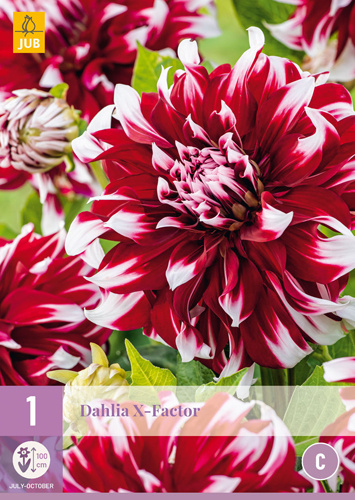 Die großblütige Tellerdahlie X-Factor ist ein lohnender Sommerblüher, der Ihnen monatelang Freude bereiten wird. Dahlia X-Factor blüht den ganzen Sommer über, von Juli bis zum ersten Nachtfrost. Dahlia X-Factor wird etwa 90-100 cm hoch. Manchmal ist es notwendig, die Blütenstängel zu stützen. Dahlienknollen können im Frühjahr gepflanzt werden. Dahlia X-Factor ist frostempfindlich, daher sollte man sich vor späten Nachtfrösten hüten. Heben Sie ein geräumiges Pflanzloch aus, lockern Sie den Boden und füllen Sie das Pflanzloch mit guter Blumenerde auf. Setzen Sie die Knollen vorsichtig in das Pflanzloch und bedecken Sie sie mit 3-5 cm Erde. Der Pflanzabstand der Dahlia X-Factor-Knollen beträgt 30-60 cm. Nach dem Einpflanzen die Knollen sofort gießen. Dahlien blühen in voller Sonne am üppigsten. Lagern Sie die Knollen nach der Blüte an einem frostfreien Ort und Sie werden jahrelang Freude an ihnen haben. Dahlia X-Factor lässt sich gut mit Stauden und anderen Dahliensorten kombinieren. Die dunkelroten Blüten mit gelben Streifen sind ein echter Blickfang im Beet. Dahlia X-Factor ist auch eine ausgezeichnete Schnittblume und hält sich gut in der Vase. Der beste Zeitpunkt für den Schnitt von Dahlien ist früh am Tag. Legen Sie die Stiele sofort in lauwarmes Wasser mit Schnittblumennahrung.