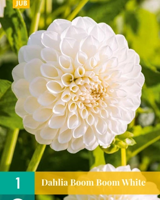 Die Kugeldahlie Boom Boom White hat schöne runde Blüten und ist ein lohnender Sommerblüher, an dem Sie monatelang Freude haben werden. Die Dahlie Boom Boom White blüht den ganzen Sommer über, von Juli bis zum ersten Nachtfrost. Die Dahlie Boom White wird etwa 100 cm hoch. Manchmal ist es notwendig, die Blütenstängel zu stützen. Dahlienknollen können im Frühjahr gepflanzt werden. Dahlien sind frostempfindlich, achten Sie also auf späte Nachtfröste. Heben Sie ein großzügiges Pflanzloch aus, lockern Sie den Boden und füllen Sie das Pflanzloch mit guter Blumenerde auf. Setzen Sie die Knollen vorsichtig in das Pflanzloch und bedecken Sie sie mit 3-5 cm Erde. Der Pflanzabstand der Knollen beträgt 30-60 cm. Nach dem Einpflanzen die Knollen sofort gießen. Dahlien blühen am üppigsten in voller Sonne. Lagern Sie die Knollen nach der Blüte an einem frostfreien Ort und Sie können sich jahrelang an ihnen erfreuen. Dahlien lassen sich gut mit Stauden und anderen Dahliensorten kombinieren. Mit ihrer knolligen Form sind die weißen Blüten ein echter Blickfang im Beet. Dahlien sind auch ausgezeichnete Schnittblumen und halten sich lange in der Vase. Der beste Zeitpunkt für den Schnitt von Dahlien ist früh am Tag. Legen Sie die Stiele sofort in lauwarmes Wasser mit Schnittblumennahrung.