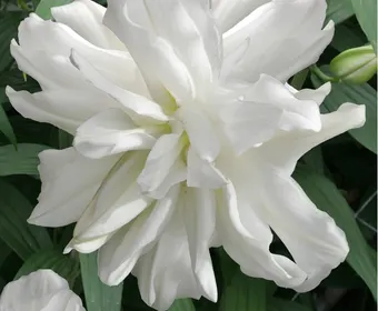 Die weiße gefüllte asiatische Lilie Lotus Ice ist mit ihrer schönen Farbe eine wunderbare Garten- und Schnittblume. Ihre Höhe beträgt etwa 100 cm. Lilien machen sich gut in Gruppen zwischen Stauden und Sträuchern. Nach der Blüte können sie ruhig in der Erde bleiben und blühen Jahr für Jahr wieder. Lilien eignen sich auch sehr gut für Blumentöpfe oder Pflanzgefäße. Die Pflanztiefe einer Lilie liegt zwischen 10 und 15 cm.