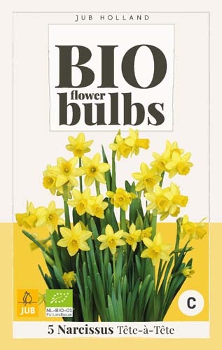 Narzisse mit vielen gelben Blüten pro Stiel. Tete-a-Tete blüht im zeitigen Frühjahr üppig und lässt sich gut mit großblütigen Krokussen, Scilla und Chionodoxa kombinieren. Sie ist eine sehr geeignete Narzisse für die Einbürgerung. Tete-a-Tete ist schön im Beet, aber auch in Töpfen auf der Terrasse oder dem Balkon. Aus biologischem Anbau.