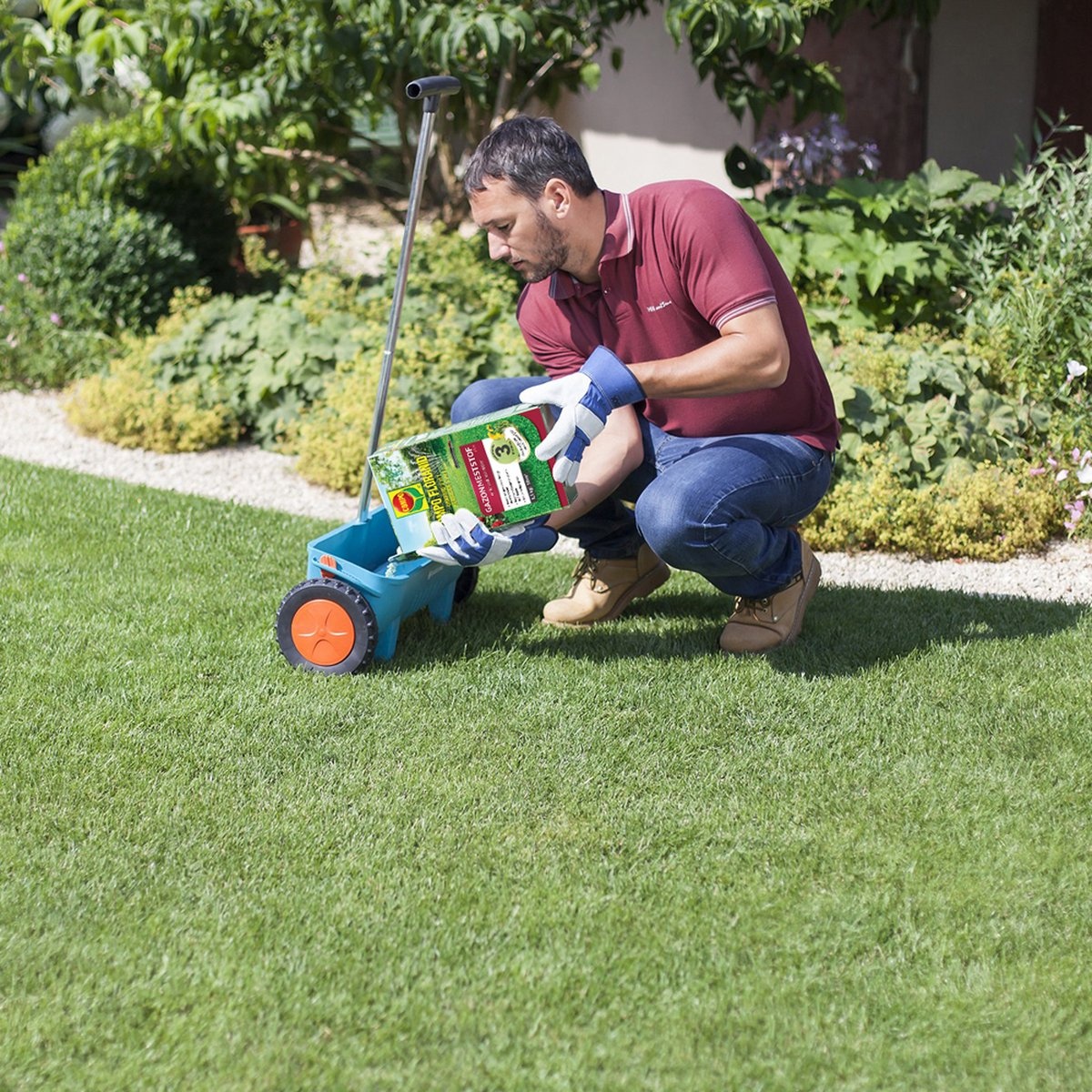 - Streuen Sie das Granulat gleichmäßig über den Rasen oder verwenden Sie einen Streuwagen.