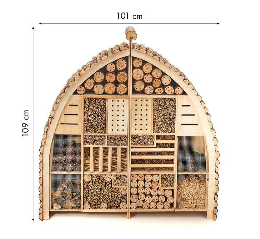 This mega-sized insect hotel is big enough to house all the insects that roam around your home, business or neighbourhood. The Giant Insect Hotel has no less than 21 rooms, with different types of stays! The Insect Hotel can rightly be called big, as this Insect Hotel is larger than 1 by 1 metre. With a height of 109 centimetres and a width of 101 centimetres, this is quite an eye-catcher. Beautiful in the garden, but also as a company you can make a contribution to the ecological cause with this Insect Hotel XXL. Attracts various insects!