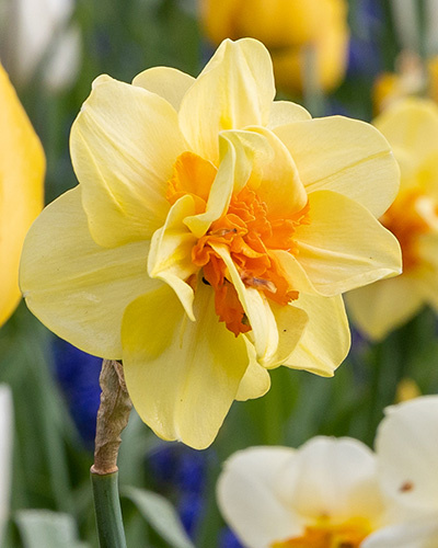 Tahiti is a beautiful double-flowered Daffodil. The flower is soft yellow with red colours in the centre. It is a very suitable daffodil for naturalising. Tahiti is an eye-catcher in the border, but also beautiful in pots on the patio or balcony. Nice to combine with Muscari, Hyacinths and Tulips.