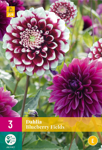 The large-flowered, decorative dahlia mix Blueberry Fields are grateful summer bloomers that will give you months of pleasure. Dahlia mix Blueberry Fields blooms all summer from July until the first night frost. Dahlia Blueberry Fields grows about 90-100 cm. high. Sometimes it is necessary to support the flower stalks. Dahlia tubers can be planted in spring. Dahlia Blueberry Fields is frost-sensitive, so beware of late night frosts. Dig a spacious planting hole, loosen the soil and fill the planting hole with good potting soil. Carefully place the tubers in the planting hole and cover with 3-5 cm. of soil. The planting distance of the tubers is 30-60 cm. After planting, water the tubers immediately. Dahlias flower most profusely in full sun. After flowering, store the tubers in a frost-free place and you will enjoy them for years. Dahlia Blueberry Fields combines well with perennials and other dahlia varieties. The flowers are real eye-catchers in the border. Dahlia Blueberry Fields is also an excellent cut flower and keeps well in the vase. The best time to cut dahlias is early in the day. Place the stems directly in lukewarm water with cut flower food.