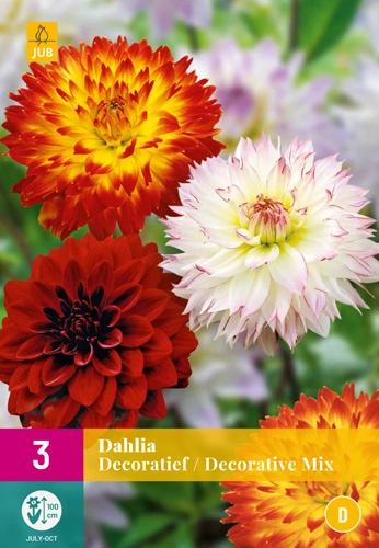 "This Decorative Dahlia mix consists of grateful summer bloomers that will give you months of pleasure. These dahlias flower all summer from July until the first night frost. Decorative type dahlias grow about 100-110 cm. high. Sometimes it is necessary to support the flower stems. Dahlia tubers can be planted in spring. dahlias are frost-sensitive, so beware of late night frosts. Dig a large planting hole, loosen the soil and fill the planting hole with good potting soil. Carefully place the tubers in the planting hole and cover with 3-5 cm. of soil. The planting distance of the dahlia tubers is 30-60 cm. Water the tubers immediately after planting. dahlias flower most abundantly in full sun. After flowering, store the tubers in a frost-free place and you will enjoy them for years. dahlias combine well with perennials and other dahlia varieties. The flowers in various colours are real eye-catchers in the border. The decorative dahlia is also an excellent cut flower and keeps well in the vase. The best time to cut dahlias is early in the day. Place the stems immediately in lukewarm water with cut flower food."