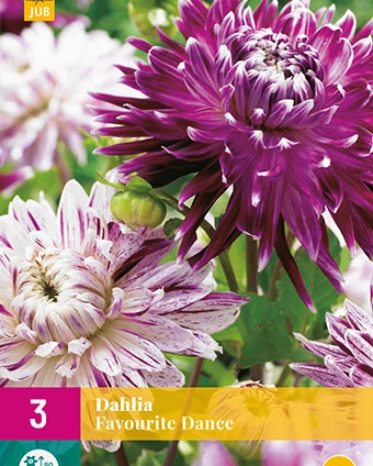 The large-flowered, decorative dahlia mix 'Favourite Dance' is a rewarding summer bloomer that will give you months of pleasure. Dahlias bloom all summer from July until the first night frost. These dahlias grow about 80-90 cm tall. Sometimes it is necessary to support the flower stems. Dahlia tubers can be planted in spring. Dahlias are frost-sensitive, so beware of late night frosts. Dig a generous planting hole, loosen the soil and fill the planting hole with good potting soil. Carefully place the tubers in the planting hole and cover with 3-5 cm. of soil. The planting distance of the tubers is 30-60 cm. After planting, water the tubers immediately. Dahlias flower most profusely in full sun. After flowering, store the tubers in a frost-free place and you will enjoy them for many years.Dahlias combine well with perennials and other dahlia varieties. The flowers are real eye-catchers in the border. Dahlias are also excellent cut flowers and keep for a long time in the vase. The best time to cut dahlias is early in the day. Place the stems directly in lukewarm water with cut flower food.