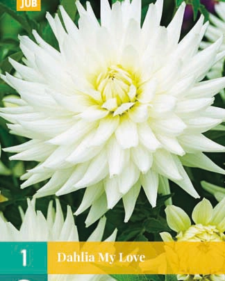 The large-flowered, cactus dahlia 'My Love' is a rewarding summer bloomer that will give you months of pleasure. Dahlia 'My Love' flowers all summer from July until the first night frost and grows about 90-100 cm. high.Dahlia tubers can be planted in spring. Dahlia 'My Love' is sensitive to frost, so beware of late night frosts. Dig a spacious planting hole, loosen the soil and fill the planting hole with good potting soil. Carefully place the tubers in the planting hole and cover with 3-5 cm. of soil. The planting distance of the tubers is 30-60 cm. After planting, water the tubers immediately. Dahlias flower most profusely in full sun. Store the tubers after flowering in a frost-free place and you will enjoy them for many years.Dahlia 'My Love' combines well with perennials and other dahlia varieties. The white flowers are real eye-catchers in the border. Dahlia 'My Love' is also an excellent cut flower and keeps well in the vase. The best time to cut dahlias is early in the day. Immediately put the stems in lukewarm water with cut flower food.