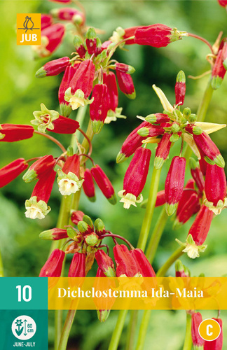 Dichelostemma Ida-Maia is also called firework flower. The flowers are beautiful fire-red with a green and white tip. It is a nice cut flower that likes a sunny spot.