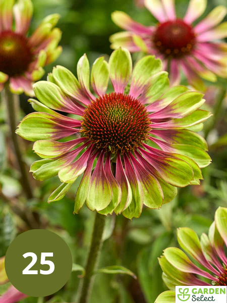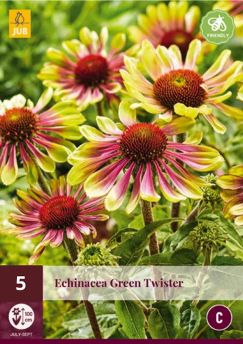 Echinacea is also called Sunflower. Echinacea Green Twister produces striking flowers in summer. They stand out because of their size and colours: a combination of a red heart surrounded by contrasting green petals. Even when the flower has finished blooming and the green petals hang down discoloured, this flower still has ornamental value. An added attraction is that during flowering it is a coming and going of countless bumblebees and butterflies. Height 70-80 cm. Echinacea is suitable for sunny spots and fertile soil that is not too wet. Give this plant a layer of 3 to 4 cm of compost every autumn so that it does not have to fight too hard with other species for nutrients.
