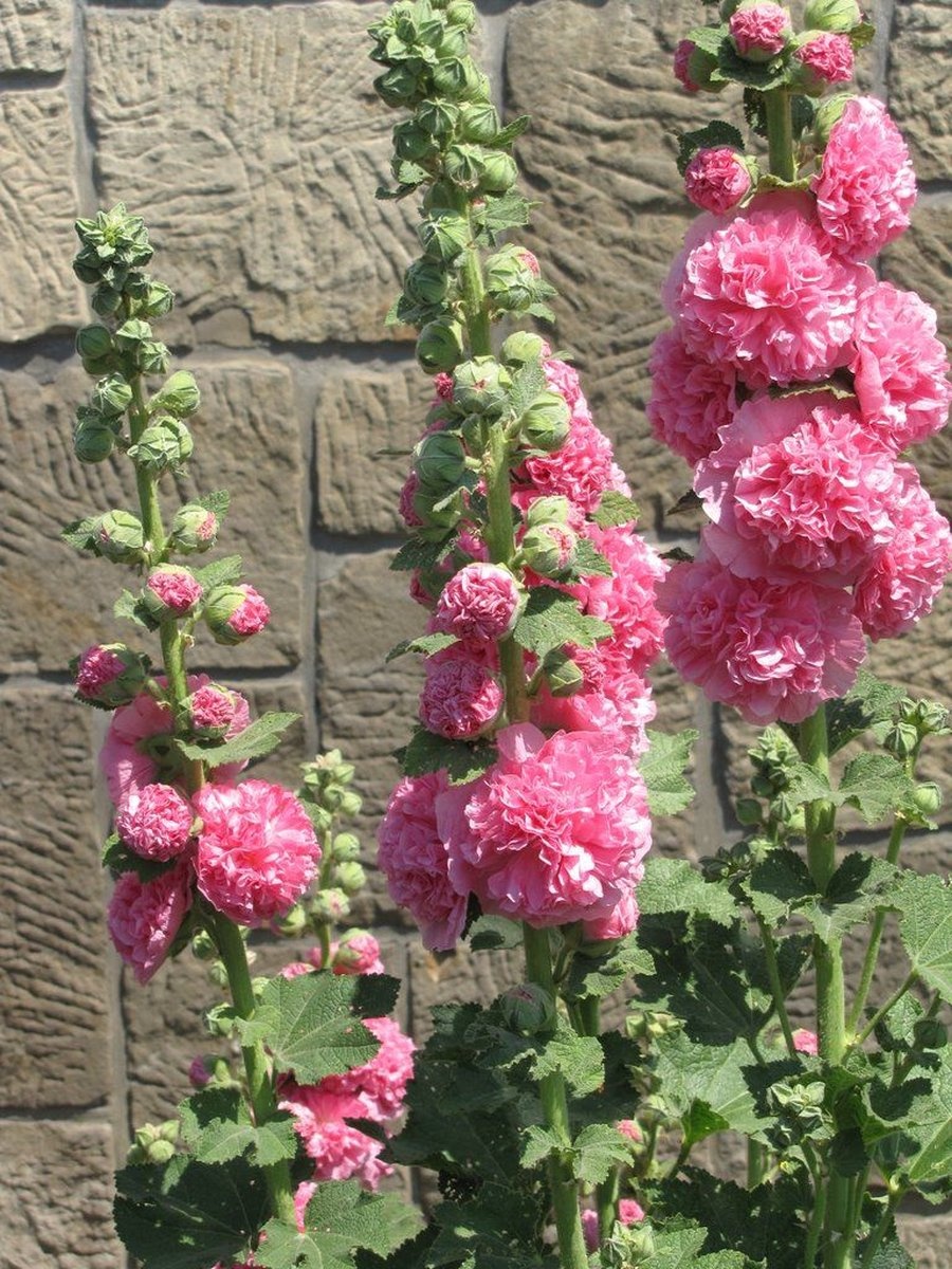Alcea rosea 'Chater's Double Pink' (Hollyhock rose) is a high-growing plant (Height 100-175 cm.) with a strong stem and double pink flowers. It is a brilliant vertical bloomer. The inflorescence is beautiful and very suitable for planting against the house or along the fence, for example. The hollyhock is a real sunbather. Well-drained, somewhat sandy soil is excellent. Be sure to fertilise sufficiently and do not let the soil dry out. Space the young plants about 50 cm apart. The nice thing about hollyhocks is that they often sow themselves and thus find beautiful spots in the garden.