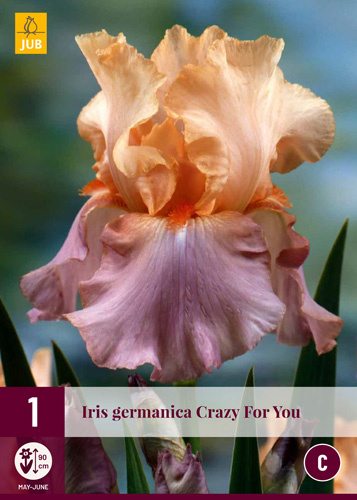 The flowers of Iris germanica 'Crazy for You' are beautifully shaped and have an orange and purple colour. Iris germanica comes in beautiful varieties. The upright petals often have a different colour than the drooping petals. This gives a nice colour contrast within one flower. On the lower petals is the so-called 'beard'. This is why these irises are also called 'Bearded Iris'. Iris germanica 'Crazy for You' is a hardy perennial and grows well in the open ground. The plant has thick rhizomes. These thick roots should be planted shallow and nearly horizontal as soon as possible after receipt. First loosen the soil well. Improve heavy garden soil by mixing in sharp sand. Make a mound in the planting hole. Place the thick rhizomes of the bearded irises about 1 cm below ground level on the mound. Fill the hole with soil and press firmly. Water immediately after planting. The planting distance is approx. 25-30 cm. These irises grow and flower well in a spot in full sun or semi-shade in well-drained, fairly dry soil. The sword-shaped, grey-green leaves die back in late summer, but new leaves appear as early as autumn. Cover the plants in winter with a layer of fallen leaves or some branches. In spring, cut off all the leaves. Soon, new shoots will emerge again.