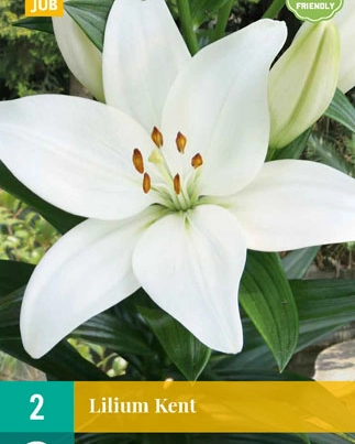 The white asian lily Kent, with its special colour, is a wonderful garden and cut flower. Its height is 90 cm. Lilies look great in groups between perennials and shrubs. After flowering, they can be left quietly in the ground and will bloom again year after year. Lilies are also very suitable for flower pots or planters.The planting depth of a lily is between 10 and 15 cm. Before planting the bulbs, make sure the soil is airy and permeable to moisture. Plant lilies sheltered from the wind along a fence or among other plants and shrubs. The flowers like to be in the sun. Bulbs of lilies can be planted both in spring, around April-May, and in autumn, October-November. In case of frost, it is best to protect the bulbs and any shoots that have already emerged with some leaves or branches.It is recommended to transplant lilies every 3-4 years. They will then draw new energy from the new soil and the lilies will bloom beautifully and colourfully for years to come. Beware of the orange lily bug: it is the lily's greatest enemy! The bugs are best controlled by removing them manually. There are various pesticides, but lily beetles quickly become immune to these.
