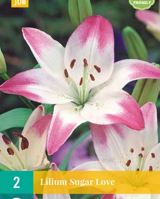 The white and pink asian lily Sugar Love is a stunning garden and cut flower with its special colour. Its height is 70 cm. Lilies look great in groups between perennials and shrubs. After flowering, they can be left in the ground quietly and will bloom again year after year. Lilies are also very suitable for in flower pots or planters.The planting depth of a lily is between 10 and 15 cm. Before planting the bulbs, make sure the soil is airy and permeable to moisture. Plant lilies sheltered from the wind along a fence or among other plants and shrubs. The flowers like to be in the sun. Bulbs of lilies can be planted both in spring, around April-May, and in autumn, October-November. In case of frost, it is best to protect the bulbs and any shoots that have already emerged with some leaves or branches.It is recommended to transplant lilies every 3-4 years. They will then draw new energy from the new soil and the lilies will bloom beautifully and colourfully for years to come. Beware of the orange lily bug: it is the lily's greatest enemy! The bugs are best controlled by removing them manually. There are various pesticides, but lily beetles quickly become immune to these.