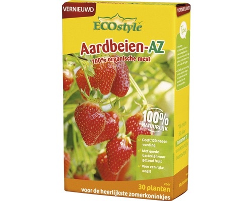 ECOstyle Aardbeien-AZ is a 100% natural, organic fertiliser suitable for strawberries and other soft fruits. The fertiliser has a long-lasting and gradual action and provides nutrition for 120 days. This ECOstyle fertiliser is rich in potassium (K) for better crop durability.