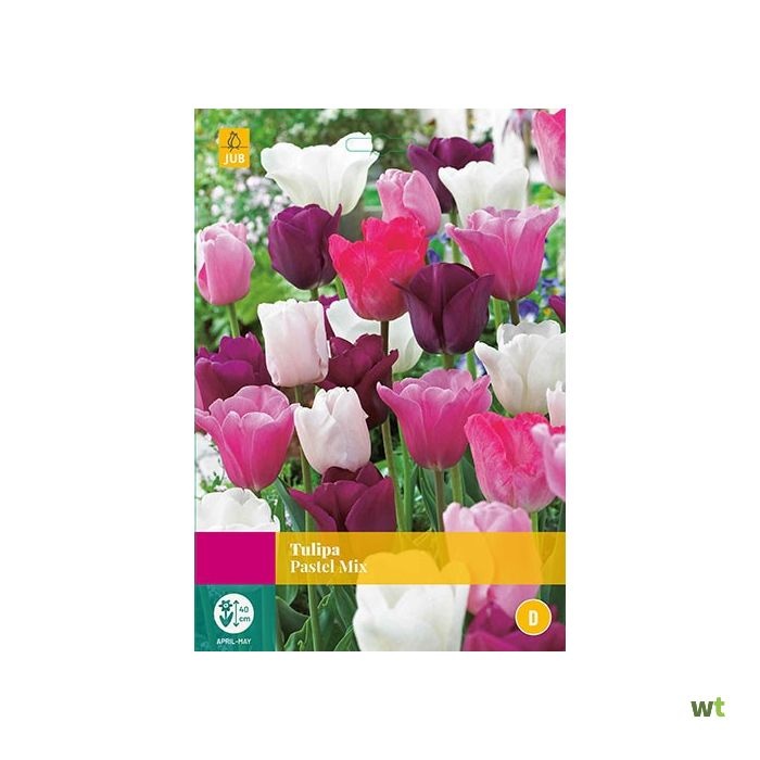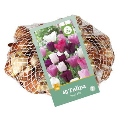 A mix of Triumph Tulips in pastel colours. Suitable for the border but also in a pot on terrace or balcony. Combines well with Muscari armeniacum or blue Hyacinths.