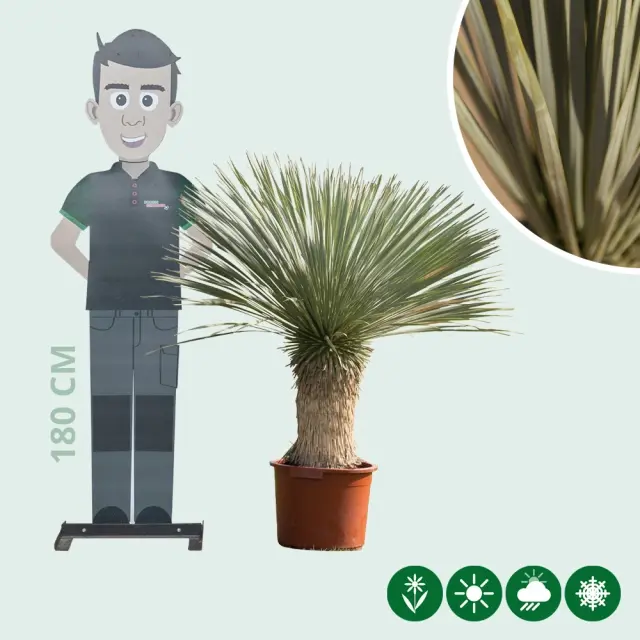The Yucca rostrata originates from Texas and Mexico, where it can sometimes freeze very hard. These palm lilies can tolerate a short period of frost of -16/-18 degrees Celsius. It is therefore a very hardy palm.