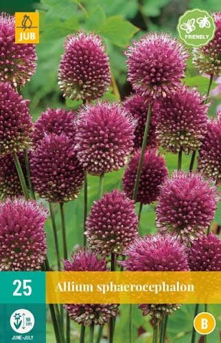 Deze Alliums in een paars-rode tint worden ook wel "trommelstokjes" genoemd. Zeer aanbevolen voor beplanting tussen vaste planten en voor verwildering. Trommelstokjes bloeien als de meeste vaste planten al flink in het blad zitten maar zullen nog geen bloemen laten zien. Plant ze dan ook in flinke getallen lekker in de vaste planten border. Deze Allium trekt tijdens de bloei vlinders en bijen aan.
