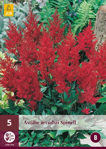 De Astilbe arendsii 'Spinell' is een rode zomerbloeiende vaste plant. De hoogte is 70-80 cm.Plant de Astilbe in de volle grond. Maak een ruim plantgat en maak de grond goed los. Verbeter arme tuingrond door er compost en wat tuinturf door te mengen. Leg de wortels van de plant op de juiste diepte in het gat (ca. 5 cm). Vul het plantgat met aarde en druk stevig aan. De beste locatie is een een plek in de half schaduw of schaduw. Tijdens de groei is het belangrijk de planten regelmatig water te geven, verminder het watergeven in het najaar. Astilbe is sterk en winterhard en goed te combineren met andere vaste planten. De bloempluimen zijn ook decoratief in gemengde zomerboeketten. Astilbe hybriden zijn vooral bekend uit border en plantvakken. De opvallende bloempluimen komen echter ook erg mooi uit in een pot. Neem een royale pot met gaten in de bodem en plant de Astilbe ongeveer 20 cm uit elkaar. Het is wel belangrijk dat de potgrond niet uitdroogt. Zet een pot met Astilbe bij voorkeur in de halfschaduw.