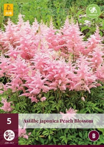 De Astilbe japonica 'Peach Blossom' is een roze zomerbloeiende vaste plant. De hoogte is ongeveer 50 cm. Plant de Astilbe in de volle grond. Maak een ruim plantgat en maak de grond goed los. Verbeter arme tuingrond door er compost en wat tuinturf door te mengen. Leg de wortels van de plant op de juiste diepte in het gat (ca. 5 cm). Vul het plantgat met aarde en druk stevig aan. De beste locatie is een een plek in de half schaduw of schaduw. Tijdens de groei is het belangrijk de planten regelmatig water te geven, verminder het watergeven in het najaar. Astilbe is sterk en winterhard en goed te combineren met andere vaste planten. De bloempluimen zijn ook decoratief in gemengde zomerboeketten.Astilbe hybriden zijn vooral bekend uit border en plantvakken. De opvallende bloempluimen komen echter ook erg mooi uit in een pot. Neem een royale pot met gaten in de bodem en plant de Astilbe ongeveer 20 cm uit elkaar. Het is wel belangrijk dat de potgrond niet uitdroogt. Zet een pot met Astilbe bij voorkeur in de halfschaduw.