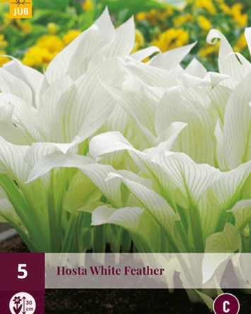 Hosta (hartlelie) 'White Feather' is een populaire plant. Dit komt vooral door het decoratieve blad. Deze plant is erg geschikt om in een ruime bloempot te planten. Het goed gevormde, ovale tot hartvormige blad is opvallend wit met groen van kleur. In de zomer verschijnen witte, bloemen langs de bloemstengels. De bloemen staan boven het blad en geven de plant ’s zomers extra sierwaarde.Hosta 'White Feather' is een prachtige bladplant die goed uitkomt in een bloempot of gewoon in de volle grond. Deze Hosta houd van een locatie met half schaduw tot schaduw.Geef uw Hosta 'White Feather' regelmatig water, de potkluit mag niet uitdrogen. Droge grond wordt slecht verdragen door de hartlelie. Knip de uitgebloeide bloemstengels aan het eind van de bloeiperiode weg. De hartlelie is goed winterhard. Verwijder in het voorjaar het afgestorven blad, al snel zult u weer de ‘neuzen’ van de nieuwe scheuten boven de grond zien komen.Hosta’s zijn ook heel fraai in de border tussen bloeiende vaste planten, zoals de Hemerocallis en Astilbes.