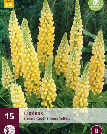 Lupinus creme geel groeit prima in de volle grond. Het frisgroene blad van de lupine is handvormig samengesteld en blijft onder de bloemen. De bloemen zitten in lange trossen rondom de stengels. Hoogte 90-100 cm.Graaf een ruim plantgat en maak de grond goed los. Verbeter de tuingrond door er wat tuinturf door te mengen. Zet de wortels van de Lupinus op de juiste hoogte in het plantgat. De bovenkant van de kluit moet net iets onder het grondniveau komen. Vul het plantgat met aarde en druk stevig aan. Geef na het planten direct water. De Lupinus creme geel groeit goed in de volle zon of halfschaduw. Zorg voor goed doorlatende, zanderige grond.