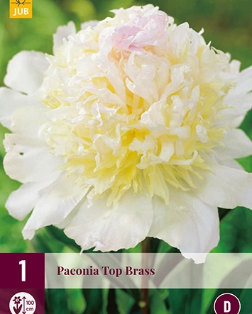 De grootbloemige paeonia 'Top Brass' is een dankbare zomerbloeier die bloeit in de maanden mei-juni. Paeonia 'Top Brass' wordt ongeveer 90-100 cm. hoog. Soms is het nodig om de bloemstengels te steunen. Paeoniaknollen kunt u in het voorjaar planten. Graaf een ruim plantgat, maak de aarde los en vul het plantgat met goede potgrond. Leg de knollen voorzichtig in het plantgat en dek af met 3-5 cm. aarde. De plantafstand van de knollen is 30-60 cm. Geef na het planten de knollen meteen wat water. Paeonia bloeien het rijkst in de volle zon. De dieprode bloemen zijn echte blikvangers in de border. Paeonia is ook een uitstekende snijbloem en lang houdbaar op de vaas. Het beste tijdstip om paeonia te snijden is vroeg op de dag. Zet de stelen direct in lauwwarm water met snijbloemenvoedsel.